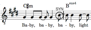 Syncopation occurs when a rhythmic pattern that typically occurs on strong beats or strong parts of the beat occurs instead on weak beats or weak parts of the beat. Like the anticipation, the syncopated note is an early arrival — it tends to belong to the chord on the following beat. Unlike the anticipation, the syncopation is tied into a note in that chord; it is not rearticulated. Rather than anticipating a note in the chord that follows, a syncopation is simply an early arrival.