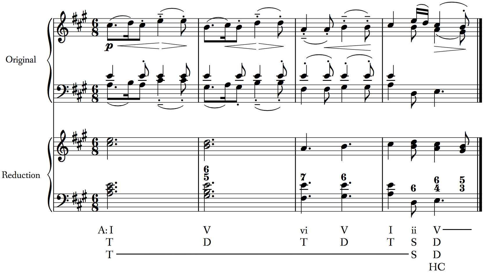 The following excerpt is from Mozart’s Piano Sonata in A Major, K. 331, I., mm. 1–4, with a harmonic reduction and analysis provided below the original score. Such an analysis is called an interpreted harmonic analysis, because the harmonies are interpreted according to the way they behave in the phrase, rather than merely labeled. In this phrase, note the following: