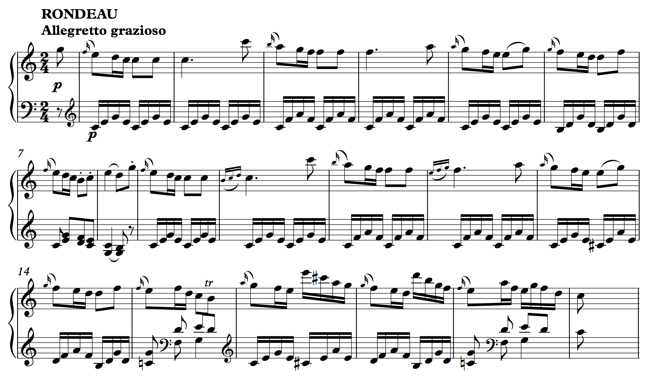 Mozart’s Rondo in F begins with a period. A half cadence in m. 6 is followed by a consequent phrase that ends with a PAC in m. 12. The theme’s exceptional length is caused in part by an expansion of the initial basic idea: in m. 3, the piano repeats m. 2. One could imagine a simple recomposition of the passage, omitting m. 3, that would restore the sub-phrase to a normal, 2-bar length.