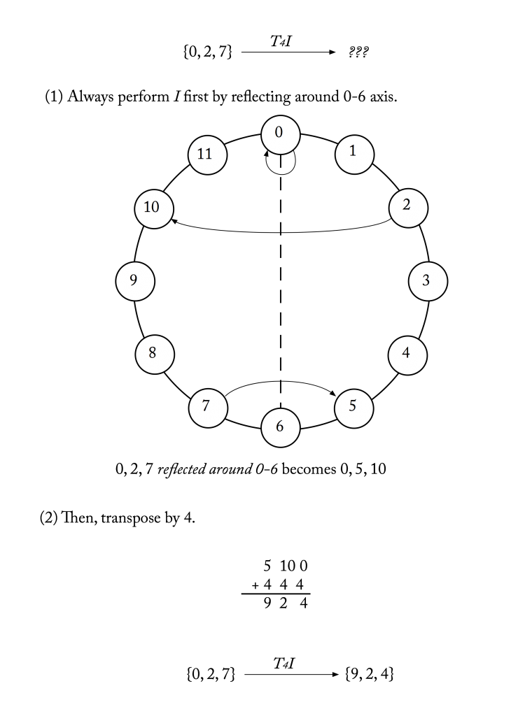 Conversely, to determine the TnI that relates two collections of pitch classes, find a common value to which they all sum. That is the n in TnI: