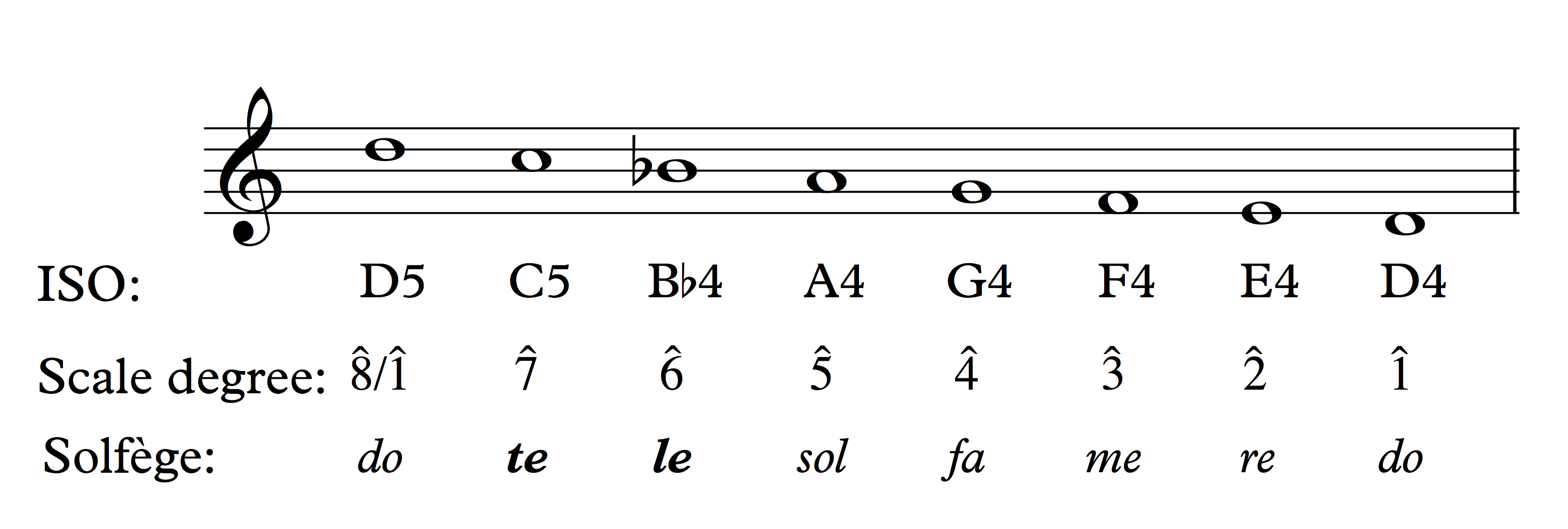 Scale degrees are labeled with Arabic numerals and carets (^). The illustration below shows a D-major scale and corresponding ISO notation, scale degrees, and solfège syllables.