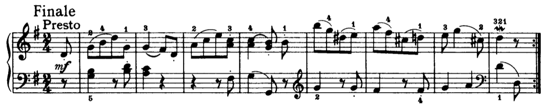 Take the opening theme from Haydn’s Piano Sonata in G Major, Hob. XVI:27, third movement.