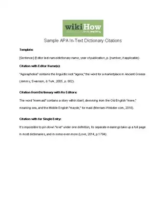 To cite a dictionary in APA when you're writing an in-text citation, start the citation after the period of the sentence. Each citation will contain either the author’s name or title of the dictionary, the year of publication, and a page number if there is one. This information appears in parentheses and is separated by commas. For example, a correct in-text citation will look something like, "The first known use of “exordium” was in 1577 (Merriam-Webster, 2005)." For tips on referencing a single entry or the whole dictionary in the reference list, read on!