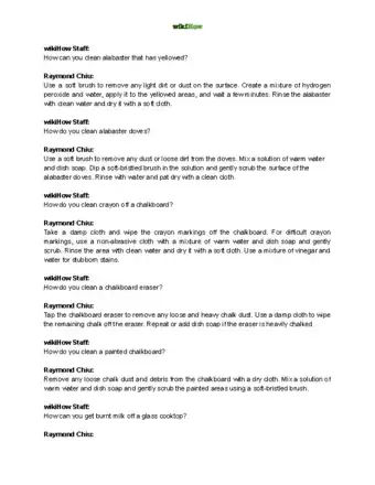 To perform light cleaning on an alabaster surface, use soft brushes, like makeup or artists’ brushes, to gently dust the alabaster. Even a fingernail can scratch alabaster, so make sure there’s no dirt or grit on the brushes before you dust. Wear latex or nylon gloves while you’re cleaning so oil from your hands doesn’t transfer to the stone, and dust the alabaster about once a week to prevent dust from accumulating. To learn how to remove stains from alabaster, read on!