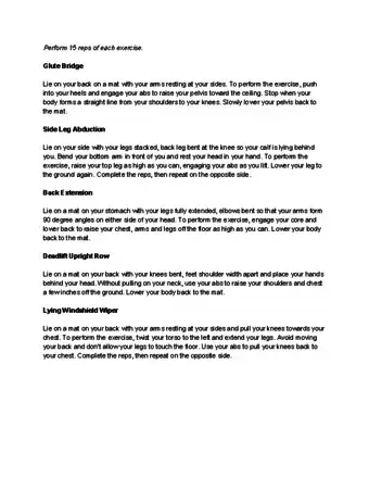 2Master leg circles. Straighten your arms and legs and lay your arms on the ground at a 45-degree angle from your body. Keep your left leg on the ground and raise your right leg straight up toward the ceiling. If that is too difficult or uncomfortable, bend your left knee.
