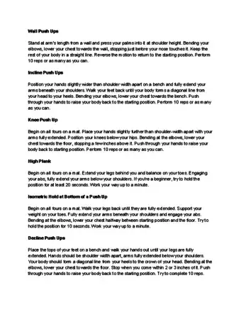 - Build up your strength with beginner's pushups, like incline pushups, tabletop pushups, knee pushups, and wall pushups.
