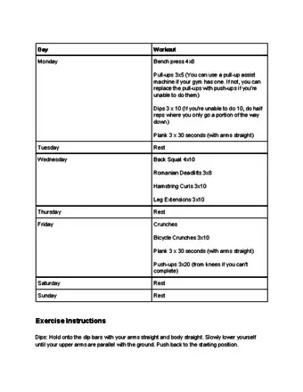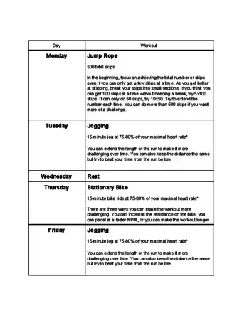 - For instance, you could jog on Monday, do upper body strength training Tuesday, swim laps on Wednesday, do a lower body workout Thursday, take a yoga class on Friday, ride your bike Saturday, and go for a light walk on Sunday.