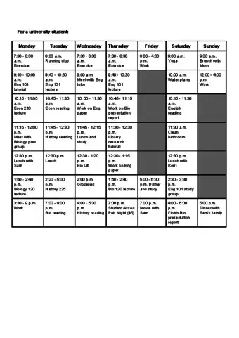 - For example, you might have to prepare an outline from 9:30 a.m. to 10:30 a.m., go to class from 11:00 a.m. to 12:15 p.m., have lunch at 12:30 p.m., and have a meeting from 1:00 p.m. to 1:45 p.m.