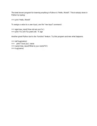 5Continue learning. These are just the basics when it comes to Python. Although it's one of the simplest languages to learn, there is quite a bit of depth if you are interested in digging. The best way to keep learning is to keep creating programs! Remember that you can quickly write scratch programs directly in the interpreter, and testing your changes is as simple as running the program from the command line again.