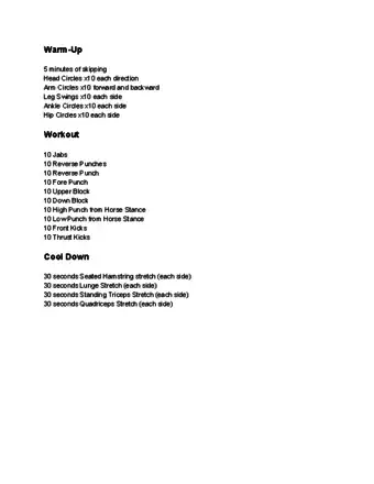 2Warm up. (10 minutes) Start off by running in place or around the block for about 5 minutes; plus about 5 minutes (or 20 reps each) of push-ups, sit-ups (or crunches), leg lifts, and reverse push-ups.[2]