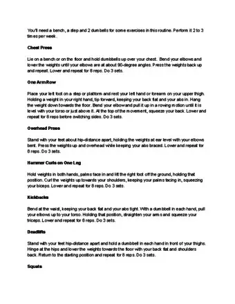 1Bench press with hand weights. You will need a stepping stool, camping cooler or workout bench for this exercise. You could also lie on the floor, an exercise ball or stack some books for extra spinal support. Lie back on the camping cooler or bench so that your knees touch the edge of the platform and your feet are firmly planted on the ground.