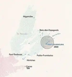 Philippe de Pastour de Costebelle, the French governor of Newfoundland since 1706, became the first governor of Île-Royale and served until 1707. He persuaded the inhabitants of Plaisance in 1714 and those of Saint Pierre and Miquelon to come live on the island. The Acadians refused to swear allegiance to the British crown, and some fled to Île-Royale instead. In 1714, they came to inspect the land and certain families, such as the Costes and the Tillards, decided to establish themselves while others only passed through before settling on Île Saint-Jean.[2] The majority established themselves at St. Peters (renamed Port Toulouse) and situated on the eastern coast of Île-Royale, recreating the Acadian colony. French ships came regularly to fish cod.