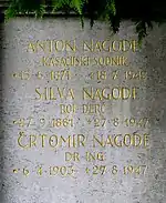 - ↑ The inscription on the Nagode family gravestone in Žale cemetery has the death date 27 August 1947, also agreeing with the date of his mother's suicide, but Boris Mlakar's article states 12 September 1947.[1] Another source gives the date as 8 September 1947.[8] The plaque on the Nagode house states that he was executed in August.