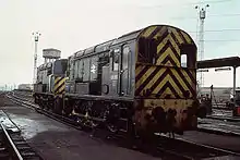 The 0-6-0+0-6-0 configuration was also applied to diesel-electric locomotives when British Rail created the Class 13 in 1965. This was done by permanently coupling two Class 08 0-6-0DE shunting engines as "master and slave" units, the latter with its cab removed. In North American terminology, this is referred to as a cow and calf arrangement. The modification came about because of a need to provide more powerful shunting locomotives for the Tinsley Marshalling Yard.[11][12]