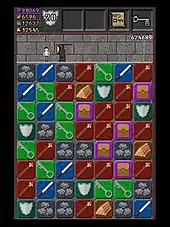 In the main starting room, the player can then spend resources to buy equipment that can be used while on the dungeon such as a spell to instantly kill the next enemy that is faced, or a key to immediately unlock a chest. Alternatively, the boarded-up rooms can be unlocked with a specific number of resources as to gain access to equipment or character upgrades to purchase that alters the mechanics of the tile-matching game, such as by increasing the strength of attacks made when four or more tiles are matched, or improving the odds for certain tiles to appear on the game board. Additionally, when starting a dungeon run, the player is given a random set of three goals to try to strive for; completing any of those goals can earn the associated rewards for the character.