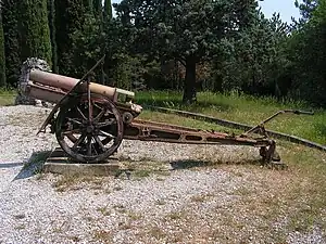 The 10 cm Gebirgshaubitze M 8 was a mountain howitzer used by Austria-Hungary during World War I. It was the first Austrian howitzer to use a modern hydraulic variable-recoil system. It used the same ammunition as the earlier 10 cm Gebirgshaubitze M 99, which was shown to be accurate, but lacked sufficient power to destroy bunkers, during World War I. It had a gun shield. It could be mounted on a special sled carriage designated 10 cm M. 8 Gebirgsschleife designed to allow for high-angle fire between +43° and 70° elevation. This sled was transported on a special bedding cart with removable wheels. The wheels were removed when in position to fire.