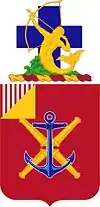 The red of the shield signifies Artillery; the blue anchor is taken from the coat of arms of the old Coast Defenses of Narragansett Bay; the four cannons form the Roman numeral ten. Battery D, 10th Coast Artillery claims parentage from Battery C, 2nd Coast Artillery (formerly 14th Company, Coast Artillery Corps and Battery C, 2nd Artillery).[6] As the 14th Company, CAC, this company was in the Coast Defenses of Narragansett Bay from 1907 through 1924.[9] The latter has no coat of arms but the addition of a canton is made to indicate this parentage, but divided since one battery can claim this parentage. Battery C, 2nd Coast Artillery was part of the garrison of Fort McHenry and commanded by Captain Frederic Evans during its bombardment, on 13 September 1814, and this event is taken from the coat of arms of the 2nd Coast Artillery and depicted in the fifteen stripes in the canton.
