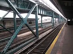 The station has five tracks and two side platforms. The express track is located on a flyover above the other four tracks. The two center tracks are not used in passenger service, but instead are used as yard leads of the Corona Yard, where 7 trains are maintained and stored. As a result, trains that go to/from the yard often terminate or begin at this station.[26][27][28] Stations with flyover express tracks such as this were far more common on IRT elevated lines in Manhattan during the 19th and early 20th centuries. Due to the yard tracks, an unusual layout takes place in and east of the station. The two layup tracks only have connections to the main tracks east of the station. The eastbound track rises east of the station while the express track lowers. The layup tracks dive down and cross under the eastbound track. The westbound track then rises to level out the three tracks, which continue east.[29]