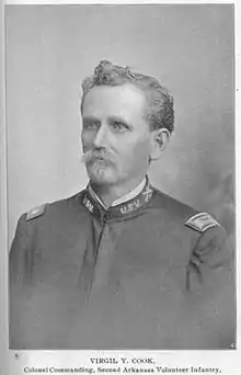 The newly formed Arkansas Volunteer Infantry Regiments did not see combat during the Spanish–American War. The 2nd Arkansas, now under the command of COL V.Y. Cook, moved to Camp George H. Thomas at Chickamauga Park, Georgia in May 1898.[8] The two Arkansas Volunteer Infantry Regiments were still there participating in basic training when the war effectively ended with the fall of Cuba and the signing of an armistice in early August.[3] The 1st Arkansas Volunteer Infantry mustered out of federal service on 25 October 1899 at Little Rock, Arkansas.[9] The 2nd Regiment continued in service until 25 February 1899, when they were mustered out at Anniston, Alabama. While the units saw no actual fighting, the deployment did have its casualties. Fifty-four Arkansas Soldiers died of disease or accident during the mobilization.[3]