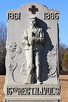 This regiment suffered higher casualties than any other infantry regiment from New Jersey.[2] At Spotsylvania, the Jersey Brigade of Wright's Division was engaged in a deadly struggle, the percentage of killed in the 15th New Jersey being equaled in only one instance during the whole war.
