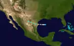 A tropical storm was first observed in the Gulf of Mexico on June 25, while located about 240 miles (390 km) south-southwest of Marsh Island, Louisiana. It headed westward and strengthened into a hurricane about 12 hours later. Peaking with maximum sustained winds 80 mph (130 km/h) and a minimum barometric pressure of 982 mbar (29.0 inHg),[2][3] the storm maintained this intensity until making landfall in South Padre Island, Texas at 1200 UTC on June 26. It quickly weakened inland and fell to tropical storm strength about six hours later. The system continued in a west-northwestward direction over northern Mexico, until dissipating in a rural area of Coahuila on June 27.[2]