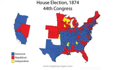 The 1874 United States elections occurred in the middle of Republican President Ulysses S. Grant's second term, during the Third Party System. Members of the 44th United States Congress were chosen in this election. The election took place during the Reconstruction Era, and many Southerners were barred from voting. Colorado joined the union during the 44th Congress. Democrats took control of a chamber of Congress for the first time since the start of the Civil War, winning a huge number of seats from House Republicans. However, the Republicans retained a majority in the Senate. The election marked the first occurrence of the six-year itch phenomenon, in which a president's party lost many Congressional seats during the president's second mid-term election.