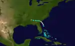 A tropical storm with winds of 60 mph (95 km/h) was first observed near Barbuda early on October 27.[11][2] The storm moved almost due west, passing through the northern Leeward Islands and then just south of Puerto Rico, Hispaniola, and Jamaica before making landfall at Ambergris Caye, British Honduras, with winds of 50 mph (85 km/h) on November 3. The system weakened as it continued westward over Mexico and dissipated on the following day near Coatzacoalcos, Veracruz.[2] Partagás and Diaz noted that "Very little information was found about this storm" and expressed "skepticism regarding the existence and evolution of this storm".[11]