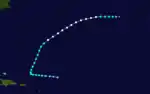 A tropical wave became a tropical depression on September 13 about 450 mi (725 km) northeast of Antigua and Barbuda.[4] The depression moved just north of due west and intensified into a tropical storm early the next day. On September 15, the cyclone turned north-northeastward and intensified into a hurricane early on September 18, shortly after curving northeastward.[2] The hurricane peaked with maximum sustained winds peaked at 85 mph (137 km/h) and a minimum barometric pressure of 1,000 mbar (30 inHg), both estimates based on ship observations.[4] Late on September 20, the cyclone turned eastward and weakened to a tropical storm. The system transitioned into an extratropical cyclone several hours later about 340 mi (545 km) west-southwest of the northwesternmost islands of the Azores. The extratropical remnants dissipated shortly thereafter.[2]
