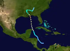 A tropical disturbance organized into a tropical depression over the southwestern Caribbean on June 28. Little intensification occurred for several days as the depression moved westward and eventually northwestward, brushing the coasts of Nicaragua and Honduras late on June 30 and early on July 1. The cyclone finally strengthened into a tropical storm early the next day and reached hurricane status late on July 3 as it neared the Yucatán Channel. Further intensification occurred in the Gulf of Mexico,[2] and at around 18:00 UTC on July 5, the storm peaked as a Category 3 hurricane with maximum sustained winds of 120 mph (190 km/h) and a minimum barometric pressure of 950 mbar (28 inHg), with the latter being derived from the former.[4] About three hours later, the hurricane made landfall near Pascagoula, Mississippi, at the same intensity. The cyclone initially weakened quickly after moving inland, falling to tropical storm intensity early on July 6. Thereafter, the system meandered northward and then eastward across Mississippi and Alabama, before turning northeastward early on July 9 and weakening to a tropical depression. Late on the following day, the depression dissipated over Alabama just east of Birmingham.[2]