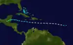 On August 27 at 12:00 UTC, a tropical storm was observed about 800 mi (1,285 km) east of Barbados. It strengthened into a hurricane about 12 hours later. The storm attained its peak intensity around the time it struck Dominica with maximum sustained winds of 80 mph (130 km/h) and a minimum barometric pressure of 986 mbar (29.1 inHg) early on August 28,[2] with the former being based on the latter, which was observed at Roseau.[4] This fast-moving hurricane tracked westward through the Caribbean and weakened to a tropical storm on August 30 while south of Haiti's Tiburon Peninsula. The cyclone weakened to winds of 45 mph (72 km/h) by the following day, but re-strengthened somewhat prior to its landfall in northern Belize with winds of 60 mph (97 km/h) on September 1. The storm moved west-southwestward into Guatemala and weakened, falling to tropical depression intensity on September 2 and dissipating shortly thereafter.[2]