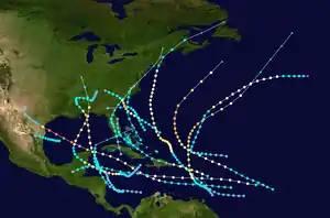 Tropical cyclogenesis began on May 13, when a tropical depression formed south of Cuba. The storm struck Cuba and Florida before becoming extratropical over Virginia on May 16. Following an almost month and a half lull in activity, the season's second tropical cyclone developed over the southwestern Caribbean Sea on June 28. The third and fourth cyclones, both reaching hurricane intensity, formed in July. The month of August featured four tropical cyclones, including a tropical storm and three hurricanes. One of those, the season's sixth tropical cyclone, became the most intensity system in the Atlantic basin in 1916 and peaked at Category 4 intensity on the modern-day Saffir–Simpson scale with maximum sustained winds of 130 mph (210 km/h).[2] In terms of barometric pressure, the storm was also the most intense to strike the United States since the 1886 Indianola hurricane.[3] Four tropical systems also developed in September, with one tropical depression,[4] one tropical storm, and two hurricanes.[2] October was the most active month of the season, featuring two tropical depressions,[4] one tropical storm, and two hurricanes. In November, a tropical storm developed on November 11 and transitioned into an extratropical cyclone by November 15, ending season activity.[2]