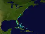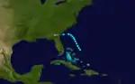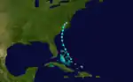On May 13, a tropical depression formed about 60 mi (95 km) south of Trinidad, Cuba. It quickly crossed the island and moved over the Straits of Florida. The cyclone strengthened to a minimal tropical storm on May 14 and soon made landfall near Key Vaca, Florida, with winds of 40 mph (65 km/h). Around 06:00 UTC the storm struck the Florida mainland near Cape Sable and initially moved north-northwestward across the state.[2] Based on observations from Tampa late on May 14, the storm's minimum barometric pressure is estimated at 1,004 mbar (29.6 inHg).[4] The cyclone turned northeastward on May 15. It transitioned to an extratropical cyclone over eastern Virginia on the following day. The remnants briefly re-emerged over the Atlantic, before striking New England and dissipating over Maine on May 17.[2] Initially, the cyclone was not included in the Atlantic hurricane database.[4]