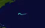 A tropical depression developed from a weak low-pressure area along a decaying stationary front about 450 mi (720 km) east of Bermuda around 1200 UTC on September 23.[4] Based on ship observations, the system is estimated to have become a tropical storm early on September 24.[8] The drifted slowly eastward for a few days and peaked with maximum sustained winds of 45 mph (75 km/h) later that day. Eventually, the system curved east-southeastward, but later continued its generally eastward motion at a faster forward speed. Around 1200 UTC on September 27, the storm weakened to a tropical depression,[4] hours before being absorbed by a cold front. This storm was not operationally tracked in real time, but was later added to HURDAT based on weather maps and ship reports.[8]