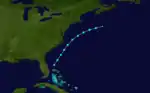 The third tropical cyclone of the season formed 420 miles (680 km) southeast of Bridgetown, Barbados on August 16. It moved northwest and crossed the eastern Caribbean as a minimal tropical storm on August 18. It passed east of San Juan, Puerto Rico and re-entered the Atlantic Ocean on August 9. It quickly strengthened, reaching hurricane status by the following day. The cyclone slowed and turned west on August 21, and it continued to strengthen east of the northern Bahamas. The cyclone strengthened to a peak intensity of 120 mph (190 km/h) north of Grand Bahama on August 24. At the time, the storm was nearly stationary. The cyclone turned sharply north, remaining offshore the East Coast of the United States. On August 25, it quickly weakened, and it passed close to Cape Hatteras on August 26. It transitioned to an extratropical cyclone, before passing over Nova Scotia on August 27.[4]