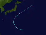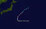 A Tropical Storm formed on September 11 and soon turned toward Japan as it gained strength. Ione soon reached category 4 intensity on September 14. Ione then began to lose strength and became a category 1 on September 16. Then, Ione struck Japan in that day killing 838 people.[7] Ione further weakened and became a Tropical Storm on the 17th. Ione then dissipated.