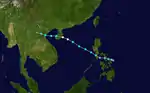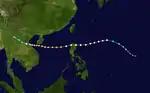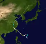 A tropical depression developed southwest of Guam on July 25. It moved north-northeastward, passing east of the Northern Marianas. On July 27, it intensified into a tropical storm and was designated Wanda. On the same day, the storm turned more westward, steered by the subtropical ridge to the north. Low wind shear and warm waters allowed Wanda to intensify steadily, developing into an intense typhoon. On July 30, reconnaissance aircraft recorded a minimum pressure of 902 mbar (26.6 inHg), and the peak winds were estimated at 295 km/h (183 mph). After passing through the Miyako Islands, Wanda weakened slightly and traversed the East China Sea. On August 1, the typhoon made landfall in eastern China near Zhoushan, Zhejiang, producing a pressure of 923 mbar (27.3 inHg); this was the lowest pressure recorded in China from a tropical cyclone. Wanda slowly weakened while progressing through China, dissipating on August 5.[1][2]