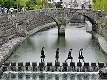 Since Megane bridge had exacerbated the flooding by catching and holding debris, blocking the escape of floodwater, it was decided to blow it up and turn it into rubble for the seawall. However, through the efforts of Mayor Gihei Nomura and others it became, in 1958, the first stone bridge in Japan to be designated an important cultural property. From 1959 to 1960 construction work was carried out to relocate it to Isahaya Park.
