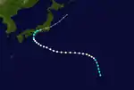 An easterly wave, the ninetieth (and final)[2] of the season, was first sighted on December 6 by the Joint Typhoon Warning Center several hundred miles southeast of Guam. The wave strengthened that day into Tropical Depression Ninety, appearing in the Japan Meteorological Agency's track data at that point. The depression curved to the northwest, striking the island Guam on December 7. Tropical Depression Ninety curved to the southeast of Saipan on December 8, strengthening into a tropical storm. Given the name Nadine by the Joint Typhoon Warning Center, it progressed northward, peaking at a minimal pressure of 974 millibars (28.76 inHg) and a wind speed of 60 mph (97 km/h) on December 10.[42][43] Nadine began to approach the International Date Line (180°), but started an extratropical transition that same day.[2][4]