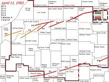 Part of the tornadoes and tornado outbreaks of 1965 1Most severe tornado damage; see Fujita scale 2Time from first tornado to last tornado | |