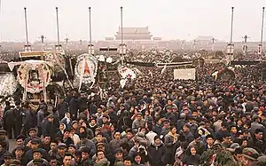 On April 4, 1976, on the eve of China's annual Qingming Festival, in which Chinese traditionally pay homage to their deceased ancestors, thousands gathered around the Monument to the People's Heroes in Tiananmen Square to commemorate the life and death of Zhou Enlai by laying wreaths, banners, poems, placards, and flowers at the foot of the Monument.[3] The most obvious purpose of this memorial was to eulogize Zhou, but Jiang Qing, Zhang Chunqiao, and Yao Wenyuan were also attacked for their alleged evil actions against the Premier.[4] A small number of slogans left at Tiananmen even attacked Mao himself, and his Cultural Revolution.[5]