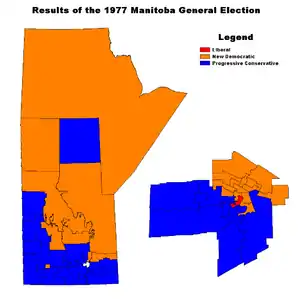 The 1977 Manitoba general election was held on October 11, 1977, to elect Members of the Legislative Assembly of the Province of Manitoba, Canada. It was won by the Progressive Conservative Party, which took 33 seats out of 57. The governing New Democratic Party fell to 23 seats, while the Liberal Party won only one seat.