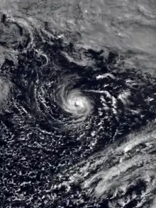 In late September, a cold-core low persisted off the coast of Portugal, moving southwestward. The system gradually developed tropical characteristics as it turned northwestward and executed a loop near the Azores. Eventually, the system organized enough to be designated as a tropical depression on October 4, while just east of the Azores. Shortly thereafter, the depression intensified into Tropical Storm Ivan.[43] However, the National Hurricane Center did not initiate advisories on Ivan until late on October 5.[44] Ivan moved largely in tandem with the upper-level low above it, while its southwest movement was caused by a building ridge to its north.[43] Late on October 5, an eye developed,[45] and Ivan was upgraded to a hurricane on the following day.[43]