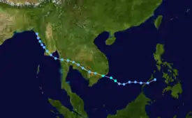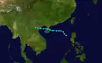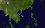 The initial disturbance was first spotted 250 miles (402 km) east of Mindanao. Moving westward for the next few days without development, the system moved into the South China Sea. The system became a tropical storm on October 7 to due significantly increased low-level southwesterlies spinning up its circulation. The cyclone then moved west-northwest, striking Nha Trang, Vietnam. The convective pattern was slow to fade as it drifted westward across Indochina over the next few days.[19] Forty perished during this tropical cyclone.[1]