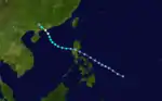 A tropical disturbance first noted east of the Philippines, the system moved through the archipelago as a tropical depression before strengthening briefly to a typhoon in the South China Sea. A combination of northeasterly vertical wind shear and proximity to land weakened the cyclone to a tropical storm before its landfall on Hai-nan and struck Chan Chiang, China as a tropical depression.[7] Winds peaked at 34 knots (63 km/h) at Tate's Cairn in Hong Kong.[1]