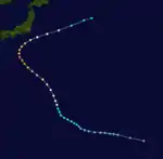On March 17, a cluster of thunderstorms grouped together which formed a low pressure area far east of the Mariana islands. The low pressure area rapidly intensified and became a tropical storm 4 days after formation. Favorable conditions allowed the system to continue to intensify into a Category 1 typhoon. High wind shear on March 25 caused the system to weakened, and it transitioned into an extratropical cyclone.