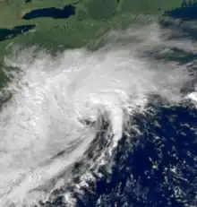 Tropical Depression Six developed offshore of the Southeastern United States on September 22 from the merger of a surface trough, a tropical wave, and a cold front. The depression quickly intensified and was upgraded to Tropical Storm Danielle six hours later. An approaching trough caused a northeastward movement, but later a high pressure system forced the storm to northwestward, which caused Danielle to execute a small anti-cyclonic loop on September 23–24. While offshore of North Carolina on September 25, Danielle reached its peak intensity as a moderately strong tropical storm with maximum sustained winds of 65 mph (105 km/h).[58] It was initially predicted that Danielle would make landfall in North Carolina;[59] however, the storm curved north-northwestward and made landfall in Maryland on the eastern shore of the Delmarva Peninsula at the same intensity. Danielle continued inland and weakened and dissipated over eastern Pennsylvania on September 26.[58]