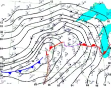 By early afternoon, the low-pressure area had moved east into Nebraska, while the warm front had moved northward into southern Minnesota.[1] The atmosphere to the south of the warm front was strongly capped, meaning that the best chance of thunderstorm development was in areas along and slightly north of the front.[3] By the time the thunderstorms started developing, CAPE values were 2000 J/kg, indicating moderate atmospheric instability.[4] Also present were low-level and deep-layer wind shear values of 44 and 87 knots (51 and 100 mph; 81 and 161 km/h), respectively. All of these factors combined to create very favorable conditions for the development of severe thunderstorms and tornadoes.[1]
