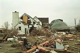 As the tornado continued to move through Brown County it achieved F4 strength and grew to 1.25 miles (2 km) wide.[36] Approximately 15% of the 1000 farms in Brown County sustained damage from the tornado,[39] and 500 dairy cattle were lost.[36] Northwest of Hanska a man was killed when the tornado caused his house to collapse. The tornado went on to cause additional damage in Blue Earth and Watonwan Counties. After traveling across six counties for 1 hour and 25 minutes and causing $75 million in damage,[33][36] the twister lifted back into the clouds at 5:15 pm 4 miles (6 km) southeast of Courtland.[34][40] In addition to the one fatality,19 people were injured by this tornado.