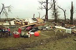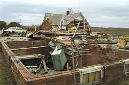 ![]() A house blown off its foundation near Hanska, Minnesota, as a result of the Comfrey F4 tornado. | |