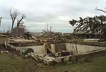 As the tornado continued through St. Peter it caused more damage and destruction. St. Peter's Catholic Church and St. Peter Evangelical Lutheran Church were destroyed, as was the Arts and Heritage Center.[45] The hospital was severely damaged and the library was hit, resulting in a loss of 25% of its books.[46] Officials estimated 500 homes in St. Peter were destroyed, 1700 more were damaged and over 17,000 trees were lost.[42][47] Many of the homes and trees that were destroyed in St. Peter were more than a century old. Debris from St. Peter that was sucked into the tornado fell back down to earth as far as Rice Lake, Wisconsin, over 130 miles (209 km) away.[9] In addition to the damage in St. Peter, the tornado also damaged or destroyed 60 homes and caused $6.5 million in damage in rural areas.[46] All together this tornado was on the ground for 18 miles (29 km) and inflicted $120 million in damage.[46]